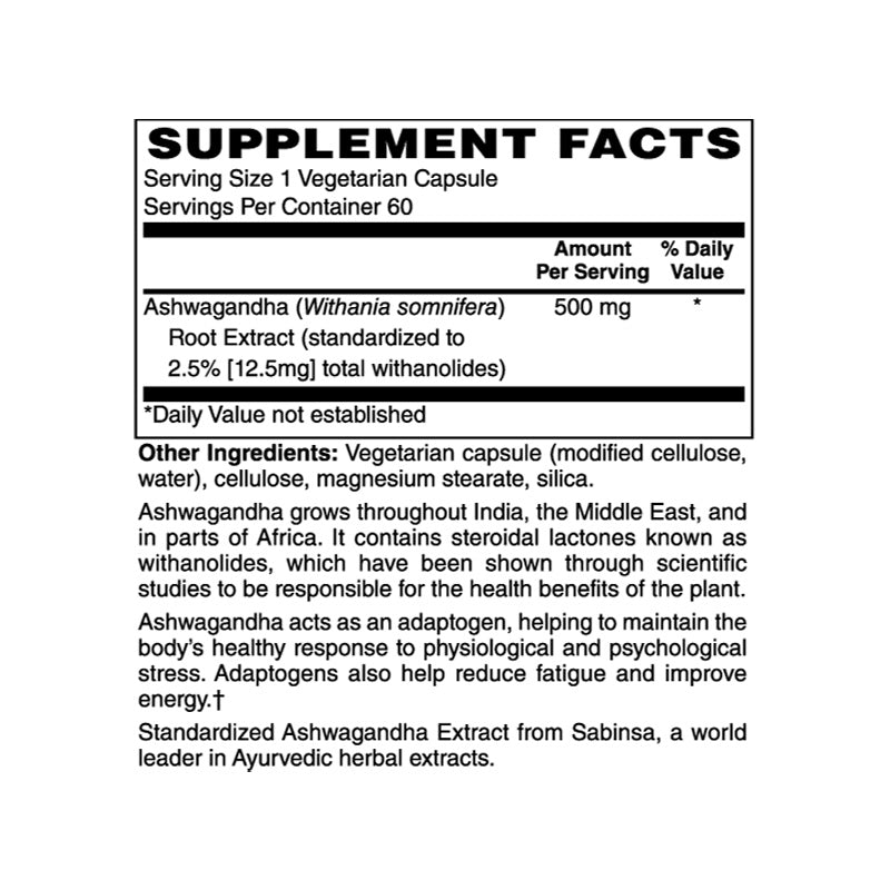 Ashwagandha root extract supplement with 500mg of standardized extract from Sabinsa. Promotes resilience to stress, enhances mental focus, and supports physical performance. Helps maintain healthy cortisol levels and encourages restful sleep; 60 vegetarian capsules per bottle.