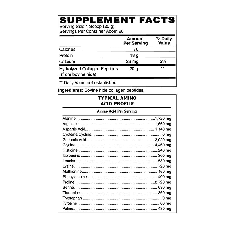 This unflavored collagen powder provides 20g of grass-fed, non-GMO bovine collagen per serving without any sweeteners, flavors, gluten, dairy, or soy. Collagen is an important protein that supports skin, muscles, and bone health.
