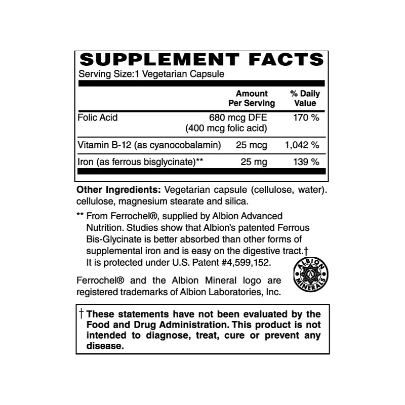 • Benefits: This iron supplement uses the patented Ferrochel® iron bisglycinate, which offers improved absorption without the gastrointestinal side effects commonly associated with non-chelated iron supplements. Iron is essential for energy production, antioxidant activity, hemoglobin synthesis, and various metabolic processes. Ferrochel® has been shown in studies to effectively increase blood levels of iron. The formula also includes Vitamin B-12 and folic acid for additional support in building healthy red blood cells.
