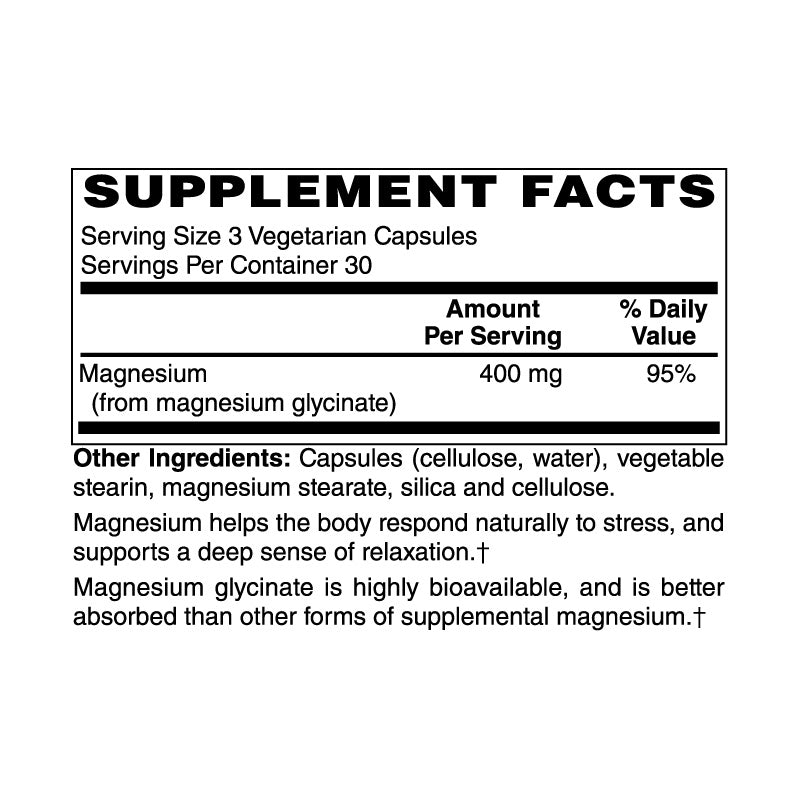 Highly absorbable magnesium form; supports muscle and nerve function, bone health, and relaxation; 90 vegetarian capsules per bottle.