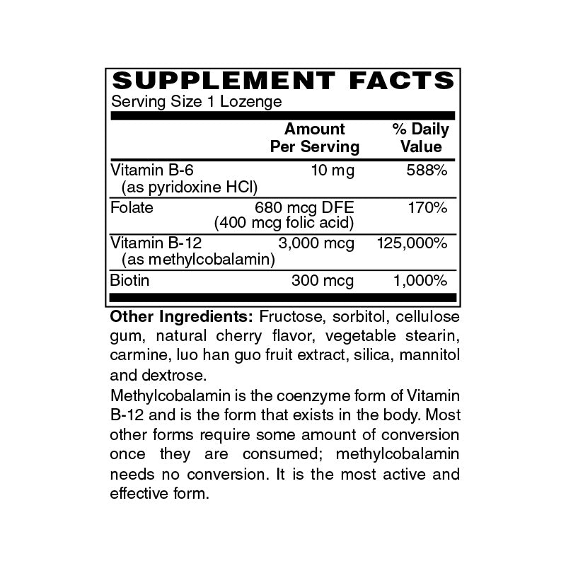 High potency Vitamin B12 (Methylcobalamin) lozenges with a great tasting cherry flavor; supports energy production and nervous system health; 50 lozenges per bottle.