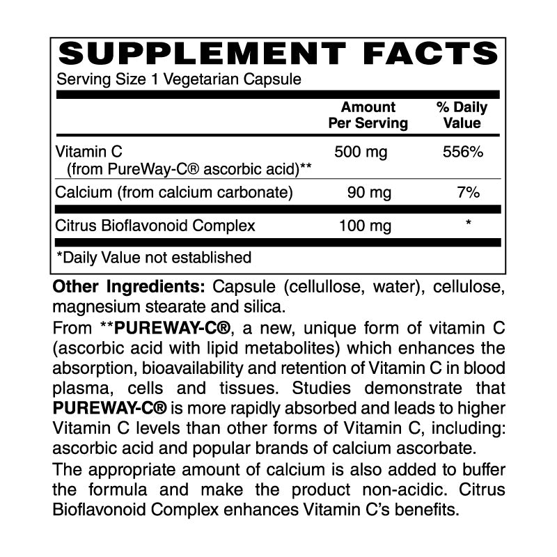 Experience the benefits of an advanced Vitamin C formula with PureWay-C®; superior cellular uptake and retention compared to other forms of vitamin C for optimal immune support and antioxidant protection; 120 vegetarian capsules per bottle.BENEFITS GUIDE