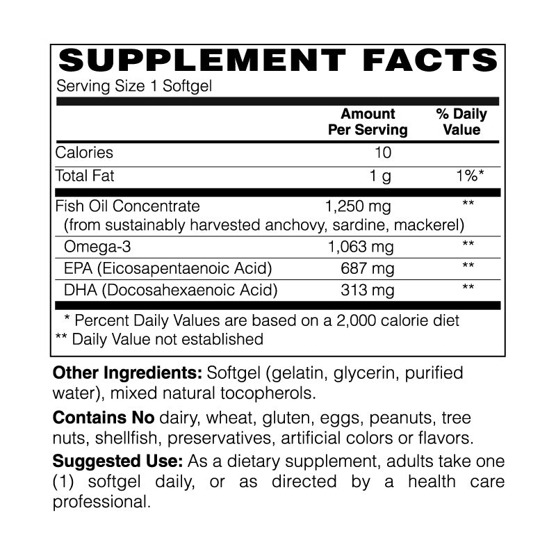 Provides 1,000mg of EPA+DHA – more than 3x the Omega-3 of standard strength fish oil – in just one softgel per day. Our Omega-3s, in the most absorbable natural triglyceride form, are molecularly distilled to ensure utmost purity and are completely free of fish by-products, guaranteeing no fishy aftertaste. Sourced from the sustainable, icy waters where anchovy, sardine, and mackerel are abundant, our softgels meet the stringent European and Prop65 standards for contaminants. They are gluten-free, Non-GMO, and designed for superior bioavailability; 60 softgels per bottle.